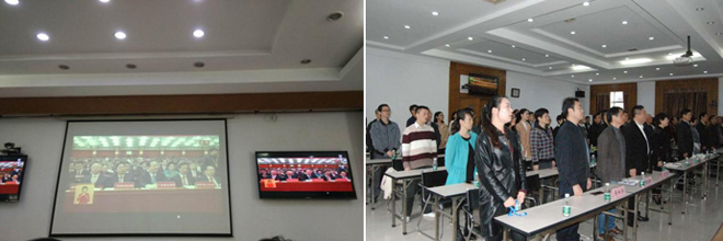 9時正,隨著李克強總理宣布大會開始,我集團公司主、分會場與會人員全體起立,懷著激昂和真摯的情感同唱國歌,共同緬懷老一輩革命家。隨后,與會人員仔細聆聽了習近平同志所作的報告,大家聚精會神、專心聆聽,不時提筆記錄報告內容和內心感想,整個會場洋溢著濃厚的學習氛圍,聽到激動人心處都情不自禁地鼓掌,為我們偉大的祖國、偉大的中國共產黨而驕傲和自豪。大家紛紛表示要不忘初心,牢記使命,堅決維護中央決定,堅決同以習近平同志為核心的黨中央保持高度一致,始終堅持黨的領導,聽黨的話,以更加飽滿的精神狀態,更加扎實的工作作風努力工作,為實現美麗中國夢貢獻個人力量。