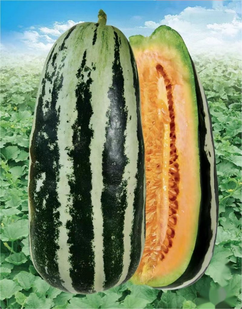 該品種為湖南省蔬菜研究所新育成的早熟甜瓜品種。春季全生育期85天左右,花后27天即可采收;秋季全生育期68天左右,花后24天即可采收。果實筒形,果皮灰白色覆墨綠色條帶,果肉桔紅色,肉質香脆,口感嫩爽,風味佳。果肉可溶性固形物含量16-18%,單瓜重500-600克,果肉厚2.2厘米左右。植株生長健壯,耐濕抗病,耐糖心,適應性強,易栽培,座果性好。