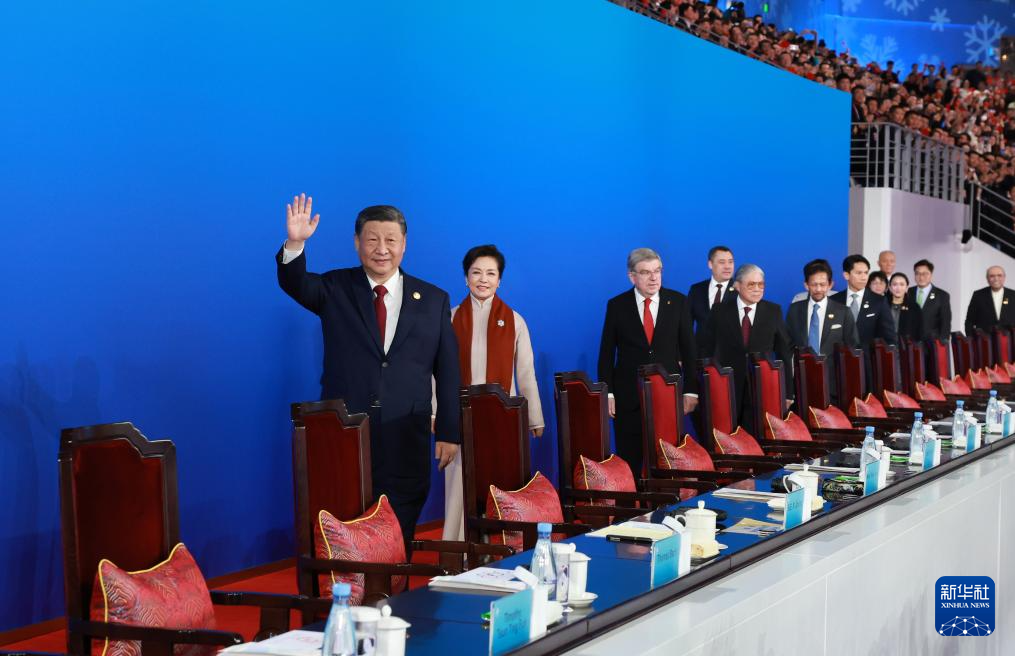 19時58分,在《和平——命運共同體》的樂曲聲中,習近平和夫人彭麗媛,同國際奧委會主席巴赫、亞奧理事會第一副主席霍震霆等步入主席臺,向觀眾揮手致意。全場響起長時間的熱烈掌聲。