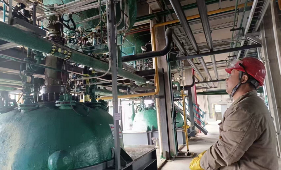 天剛蒙蒙亮,晨光便灑進(jìn)了海利貴溪公司廠區(qū)。丁硫車(chē)間那一排高大的反應(yīng)釜,在熹微的曦色里泛著冷峻的金屬光澤。饒斌像往常一樣,早早來(lái)到廠里。他熟練地戴上安全帽,手持對(duì)講機(jī),開(kāi)啟了每日雷打不動(dòng)的車(chē)間巡檢工作。他沿著管線,時(shí)而停下腳步,側(cè)耳細(xì)聽(tīng)設(shè)備運(yùn)轉(zhuǎn)的聲響,時(shí)而湊近儀表盤(pán),仔細(xì)查看各項(xiàng)數(shù)據(jù)。不知不覺(jué),一個(gè)上午就悄然過(guò)去了,而這不過(guò)是饒斌日常工作的普通一幕。